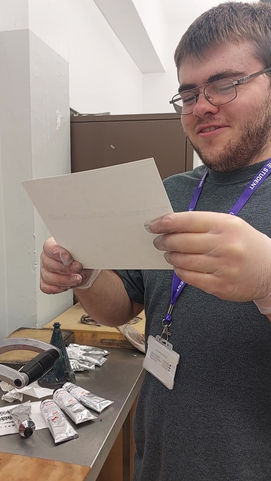 I teamed up with a classmate during this time as there were not enough letter sets and chases (things to put the letter sets and furniture into) for everyone. I also asked if I could film him and add him to my blog to show the process of inking up the press and applying it onto the paper.